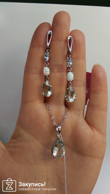 Начну пожалуй вот с этого нежнейшего набора с зеленым аметистом, опалом и топазом. Сережки Мали- http://evoradeparis.ru/internet-magazin/pr...yy-ametist-mali и подвеску подобрали вот эту Валерия - http://evoradeparis.ru/internet-magazin/pr...metist-valeriya . На фото сережек с сайта,зеленый аметист кажется ярче, но на самом деле фото подвески ближе к истине. Цвет светло-светло зеленый. Все три камушка красиво сверкают и очень гармонично друг-друга дополняют, не спорят между собой. Но опал мне кажется все же задает тон всему украшения, не зря его в центр поместили
