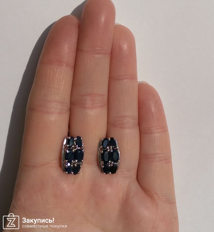 И сережки с сапфирами. Цвет камней темно-темно синий(почти чернильный). Имеет очень густой и плотный цвет, не прозрачный. Смотрится модель очень стильно и строго.