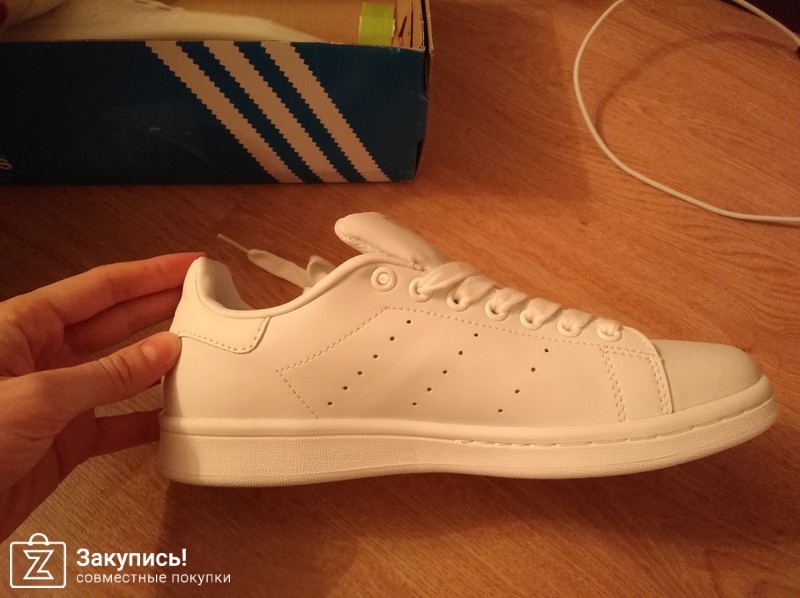 Красивые кроссовки Adidas Stan Smith, мне нравятся:) единственное, что, когда надеваешь, ощущение, что маломерят (по new balance было такое же), но похоже, что разносятся (new balance ношу почти не снимая - очень удобно). На мой 37 купленный 37 очень впритык.