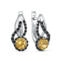 Серьги из золочёного серебра с цитрином, чёрной шпинелью и родированием 925 проб