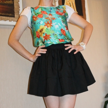 Футболка яркая, приятная, размер универсальный 42-44 + юбка, брала размер L, думаю, что М была бы короче))) ткань не просвечивает, очень пышная, хотя и без подклада.