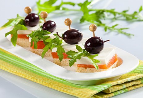 намазываю хлеб маслом, сверху семгу и сыр, украшаю оливками