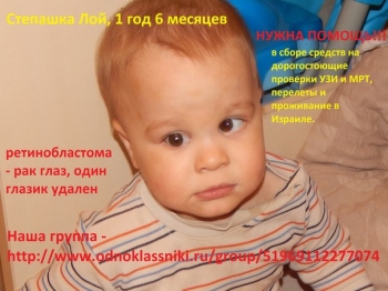У Стёпы остался всего один глазик. Правый глазик удален, он ведь не вырастет снова.  Вместо правого глазика стоит протезик, который  каждые  два дня в целях гигиены родители достают из полости глазницы, промывают теплой водой  и ставят обратно. Очень становиться жутко при мысли, что и левый глазик можно  не сохранить. Ведь через 6 месяцев ремиссии у Стёпашки снова появлялась опухоль в сохраненном левом глазике. И благодаря тому, что малыш регулярно и в определенные сроки  проходит проверки в Израиле, врачам удалось вовремя заметить, оперативно начать лечение и побороть страшную опухоль. Стёпе просто жизненно необходимо проходить проверки в Израиле, что бы сохранить то, что  с таким трудом сохранили.