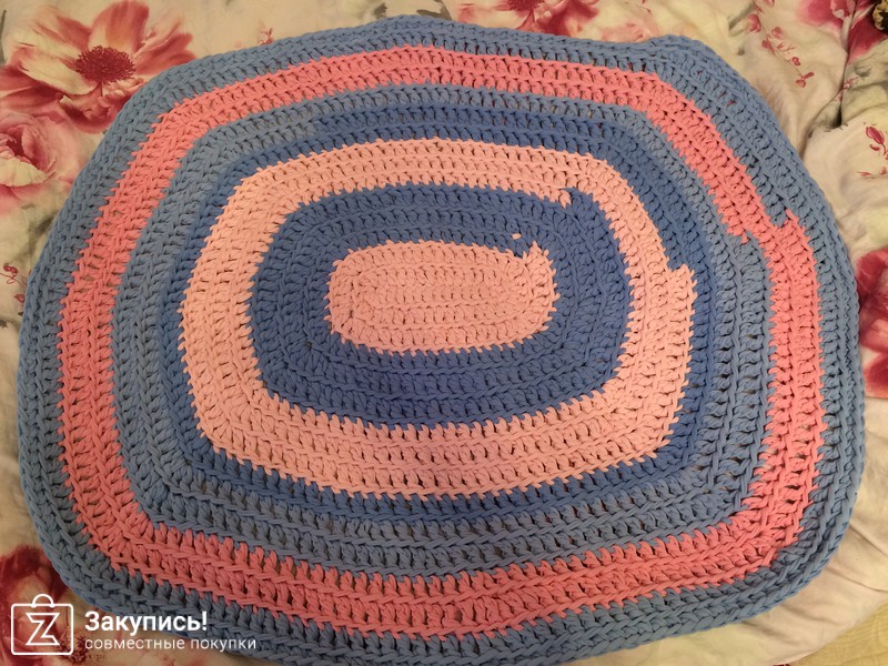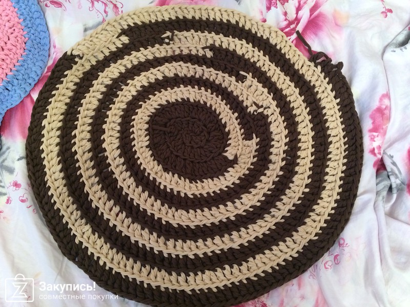 я в прошлый раз брала по моточку бежевого, шоколадного, сакупа и небесный вроде. Решила деткам коврики в их комнаты связать, бежего-коричневый в диаметре 63 см ушли по моточку, еще взяла по одному чтобы закончить его. На розовый еще докупала в другом месте 3 мотка, по цвету не попала, но ничего дочке понравился. Т.е. на него ушло 5 мотков и размерах он 80на 100 см Вяжу без схему стобиком с одним накидом, крочком 10