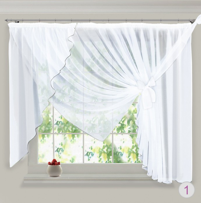Занавеска из мягкой вуали средней прозрачности. состоит из 2-х частей, пришитых на одну шторную ленту. Украшена атласной бейкой в тон швета шторы. 100% полиэстер. светонепроницаемость -10-12%. Производство FIRANKA.