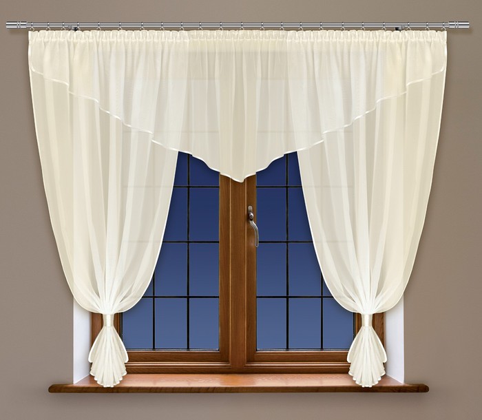 Занавеска из мягкой вуали средней прозрачности. Украшена атласной бейкой и подхватками на кнопочках. Все детали пришиты на одну шторную ленту. Максимальная высота - 170 см. Макс. высота ламбрекена - 40 см. 100% полиэстер. Светонепроницаемость -10-12%. Производство FIRANKA.