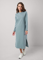 Платье из трикотажного эластичного полотна кашкорсе. Прямого силуэта длиной миди,по бокам разрезы. Округлая горловина с окантовкой. Длинный втачной рукав, внизу нашивка. На спинке принт.