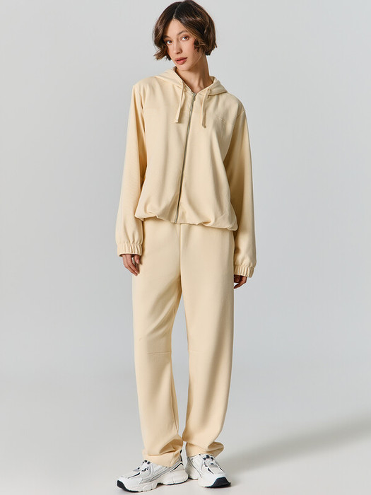 Боковые швы смещены вперед, чтобы создать более плавный и женственный силуэт. На поясе предусмотрена мягкая резинка, а в боковых швах спрятаны удобные карманы. Особый крой в области колена позволяет брюкам сохранять свою форму и не сковывать движения при ходьбе.