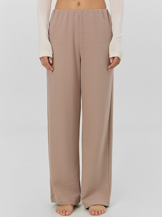 Брюки с посадкой на талии свободного силуэта. Пояс цельнокроеный с резиной внутри 40RV подвернутый внутрь. Низ изделия обработан швом в подгибку.