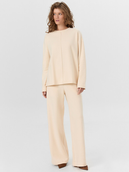 Джемпер свободного силуэта. Горловина обработана обтачкой из рибаны. Перед с отстроченным центральным швом, спинка цельнокроеная. Рукав длинный, втачной. Низ изделия и рукавов обработаны швом в подгибку.