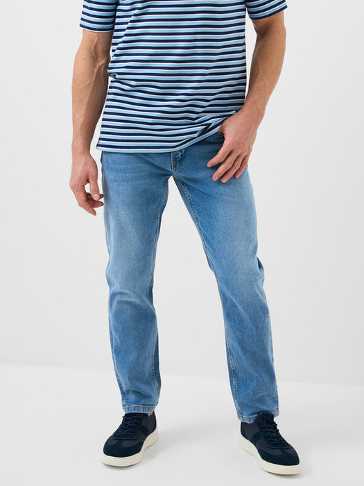 Мужские джинсы прямого кроя с классической посадкой. Выполнены из варёного синего денима. Застёгиваются на металлическую молнию и болт. На поясе — шлёвки под ремень и кожаная нашивка с логотипом. Спереди — стандартные карманы, сзади — два накладных кармана. Карман украшен вышивкой.