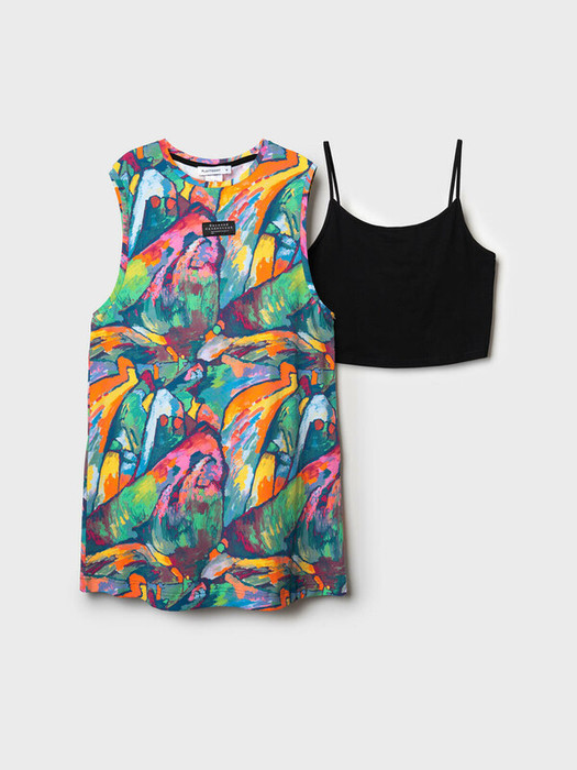 Летний женский комплект. Стильный топ и платье выполнены из мягкого хлопкового трикотажа с ярким художественным принтом. Дизайн основан на произведении Василия Кандинского под названием "Импровизация 7". Топ с регулируемыми бретелями. Платье свободного кроя, с круглым вырезом горловины. Можно составить family look c детским вариантом аналогичного дизайна.