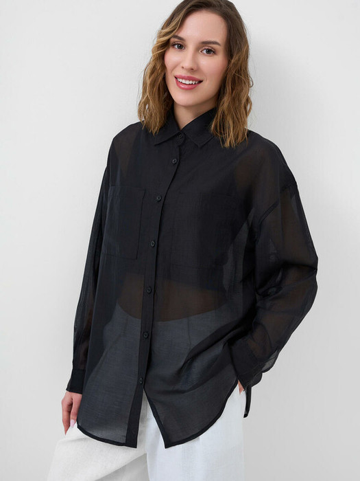 Женская рубашка. Модель свободного кроя с длинным рукавом. Выполнена из лёгкой и полупрозрачной ткани, что придаёт образу воздушность. У рубашки классический воротник, застёжка на пуговицы и два нагрудных накладных кармана. Рукава с манжетами на пуговицах.