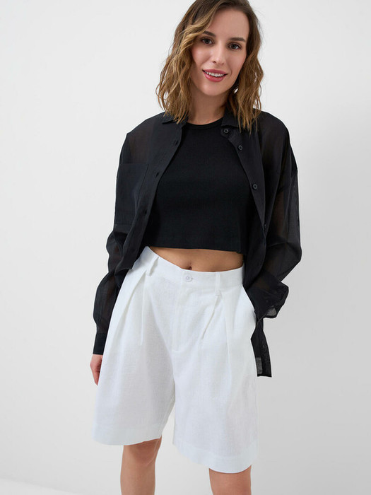 Классические женские льняные шорты. Модель средней длины, чуть выше колена. Комфортная посадка и прямой силуэт, который немного расширяется к низу. Шорты застёгиваются на молнию и пуговицу, и имеют боковые карманы. Пояс дополнен шлёвками для ремня.
