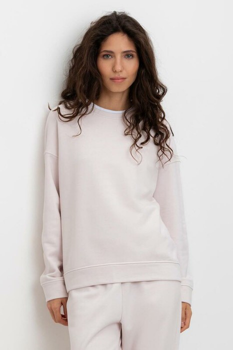 Объемный свитшот из двухцветного трикотажного футера. Внутренняя сторона изделия представлена в натуральном цвете хлопка, внешняя в нежно-розовом. За счет использования крашенной пряжи, данный вид полотна прошел минимальную обработку, что придало изделию мягкость и шелковистость.