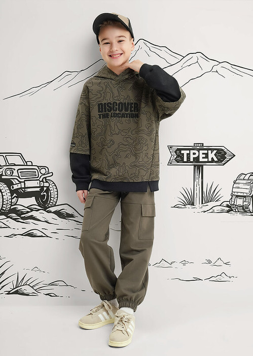 Удобные брюки из мягкого футера для мальчика с декоративными рельефами в области колен. Модель оснащена накладными карманами, эластичным поясом с регулировкой по талии для комфортной посадки.Сочетай брюки с футболками и толстовками из новой коллекции!