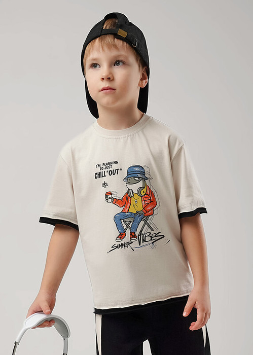 Стильная футболка оверсайз из 100% хлопка для мальчика с эластичной горловиной обеспечивает комфорт. Оригинальный принт на передней части привлекает внимание. Характерной деталью модели являются необработанные двойные края по низу изделия и рукавам.