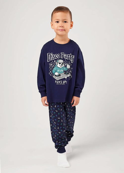 Новогодняя хлопковая пижама из джемпера и брюк. Горловина , манжеты по низу рукава и брюк из эластичного полотна. Лонгслив свободного кроя со спущенным плечом и крутым принтом.Брюки среднего объема, эластичный пояс обеспечит комфорт и идеальную посадку.