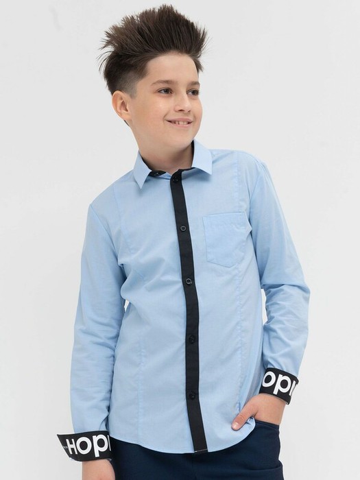 Школьная рубашка для мальчика из практичной ткани с современными деталями. Самые уязвимые для грязи детали выполнены из ткани контрастного цвета. Это разбавляет официальный стиль и позволяет не стирать белую рубашку каждый день.