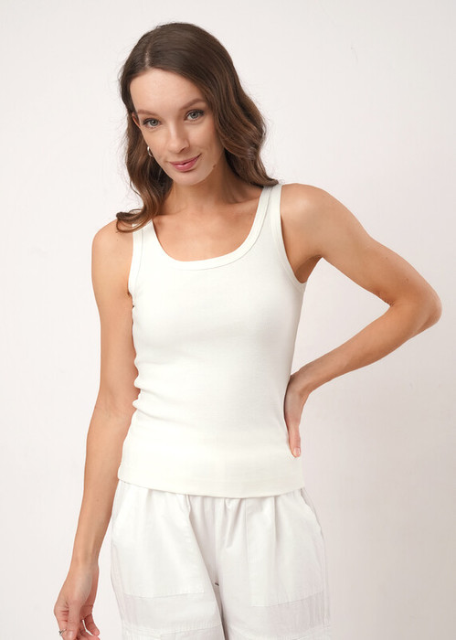 Майка из эластичного трикотажного полотна рибана по фигуре на широких бретелях. Круглый вырез горловины.