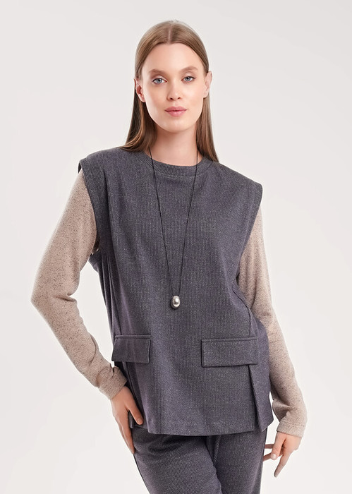 Жилет из трикотажного поливискозного полотна джерси, прямого кроя. Округлая горловина с обтачкой. По пройме подкройная обтачка. Спереди резы со шлицей и декоративными клапанами. По низу изделия потайной стежок.