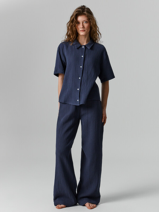 Брюки свободного силуэта. Пояс цельнокроеный, с эластичной тесьмой внутри. По правой, передней половинке выполнена имитация гульфика.  Нижние срезы обработаны швом вподгибку.