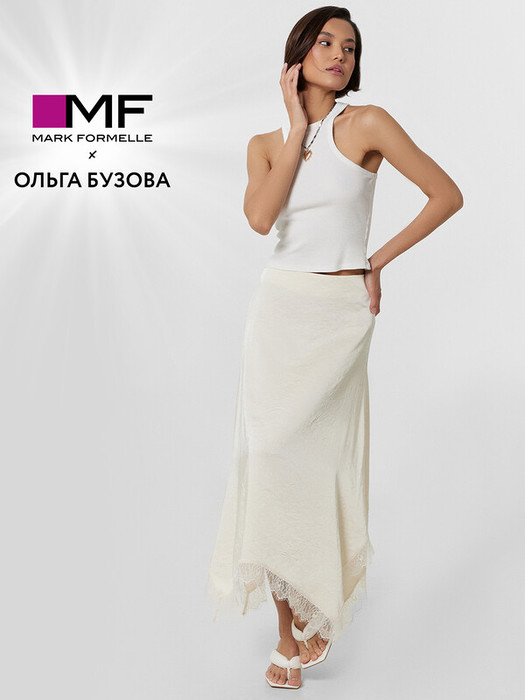 Юбка женская Mark Formelle x Ольга Бузова с кружевными деталями. Лимитированная коллекция "Мне можно все" — яркое и стильное решение для поклонников современного дизайна и самовыражения. Эта элегантная юбка А-силуэта — идеальное сочетание женственности и утонченности. Длина миди подчеркивает изящность образа, создавая гармоничные пропорции. Потайная молния в боковом шве делает посадку аккуратной, обеспечивая комфорт и удобство в носке. Фигурный нижний срез, декорированный кружевом, добавляет юбке романтичный акцент, придавая образу нежность и изысканность. Изделие выполнено из смесового материала с добавлением вискозы, который отличается мягкостью, легкостью и приятной текстурой. Эта юбка станет стильным дополнением как повседневных, так и особенных образов, позволяя создавать элегантные и гармоничные сочетания.