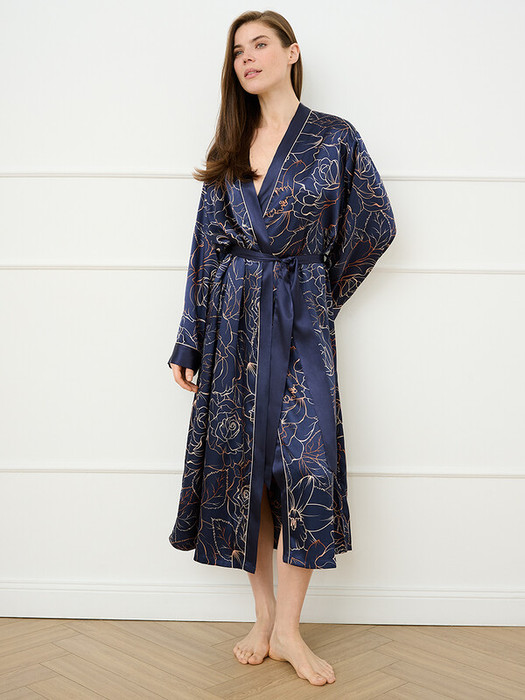 Женский халат на поясе с цветочным принтом и контрастным кантом. Модель с широкими длинными рукавами длиной до середины икры.