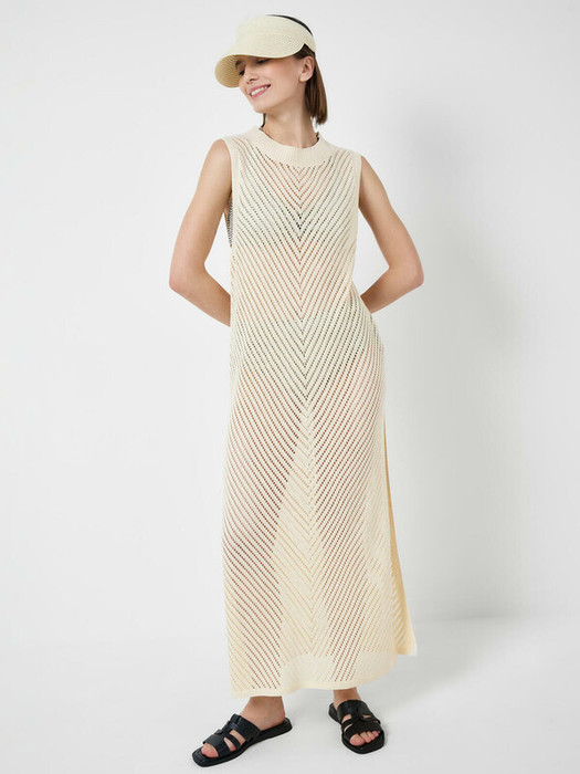 Женская пляжная туника из легкого ажурного трикотажа. Модель без рукавов, с круглой горловиной и свободным прямым кроем, длиной до щиколотки. По бокам предусмотрены разрезы, что добавляет изделию лёгкости и подвижности. Горловина, проймы и низ изделия обработаны контрастной вязаной отделкой. Идеально подходит для пляжа или летнего отдыха.
