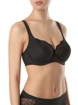 Бюстгальтер модели Soft bra with wire с мягкими чашками, без каркасов, с боковыми корсетными вставками, выполнен из нежного кружева черного цвета с серебряным напылением. Регулируемые бретели черного цвета украшены декоративными пряжками черебряного цвета со стразами. Застежка на 2 крючка и 3 ряда петель. Размерная сетка XS-(84/70A-B), S-(88/75A-B), M-(92/75C), L-(96/80B-C), XL-(100/85B-C)