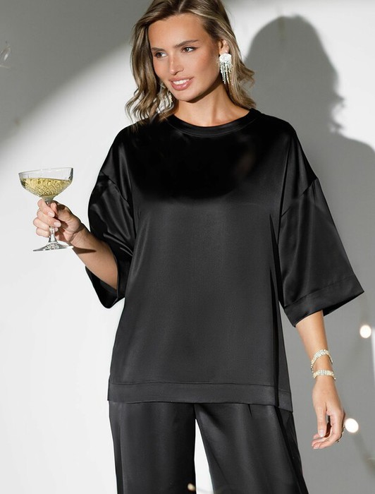 21.04 Vilatte Блузка свободная из струящегося плотного сатина D29.279 черный