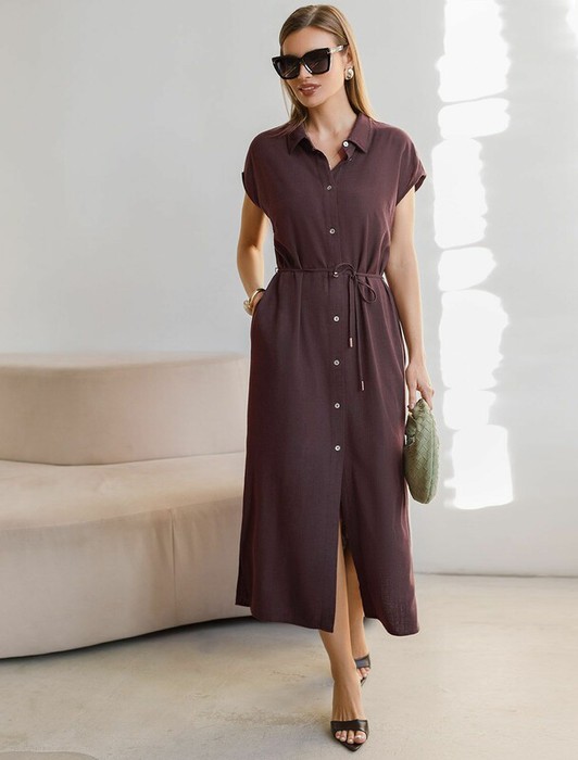 Совместные покупки Челябинск Женская одежда Платья — Vilatte Длинное платье-рубашка с поясом и разрезами изо льна с вискозой D22.269