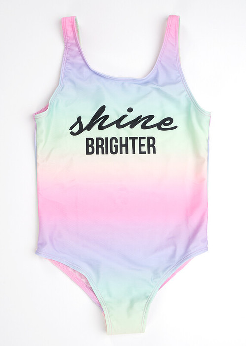 Сплошной базовый купальник в яркую радужную набивку с принтом. Впереди на подкладе.