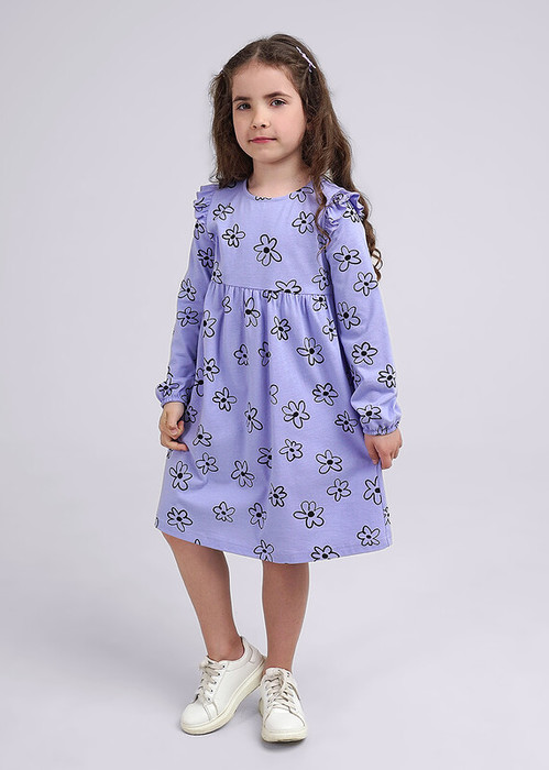 Милое хлопковое платье для яркой принцессы. Романтичные крылышки, широкий рукав, собранный по низу, фигурная завышенная талия и юбка со сборкой. Стильные интересные набивки подарят хорошее настроение на каждый день.