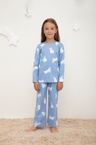 Трикотажная пижама с начёсом из натурального хлопка. Джемпер с длинными спущенными рукавами и брюки с эластичной резинкой в поясе. Мягкие манжеты на рукавах и по низу брюк. Оригинальные набивка и принт выполнены из стойких гипоаллергенных текстильных гипоаллергенных красителей. Изделие сохраняет цвет и форму после многократных стирок. Все трикотажные полотна производятся в соответсвии с нормами швейцарского сертификата ЭкоТекс.