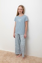 Трикотажная пижама в рубчик из натурального хлопка. Джемпер с длинными втачными рукавами и лосины с эластичной резинкой в поясе. Оригинальная набивка выполнена из стойких текстильных гипоаллергенных красителей. Изделие сохраняет цвет и форму после многократных стирок. Все трикотажные полотна производятся в соответствии с нормами швейцарского сертификата ЭкоТекс.