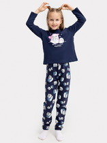 Трикотажная пижама для девочки с футболкой и велосипедками. Удлинённая футболка изготовлена из гладкого трикотажа супрем. Велосипедки выполнены из эластичного трикотажа в рубчик. Оригинальная набивка и принт выполнены из стойких текстильных гипоаллергенных красителей. Изделие сохраняет цвет и форму после многократных стирок. Все трикотажные полотна производятся в соответсвии с нормами швейцарского сертификата ЭкоТекс.