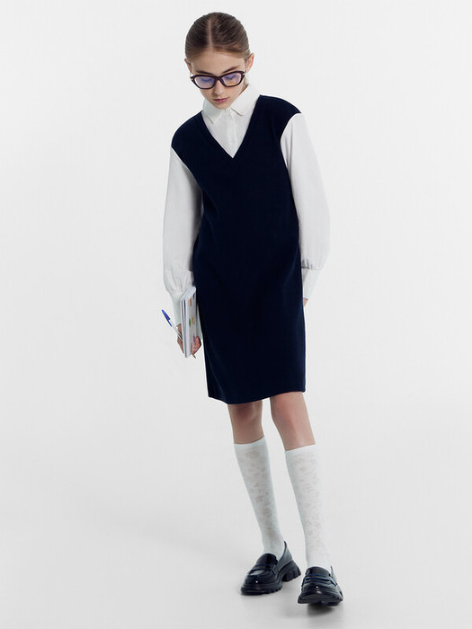 Селаник. Платье свободного силуэта, с имитацией жилетки и рубашки. Жилет-платье из селаника горловина V-образной формы. Рубашка из ткани горловина круглой формы, воротник с цельнокроенной стойкой. По переду центральная застежка на пуговицы. Плечо спущено, пройма углубленна. Рукава втачные, длинные из ткани. Низ рукава немного расширен и присборен, по низу рукава отрезная манжета из ткани. Платье длиной выше колена.