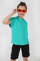 Футболка свободного кроя, втачной рукав. Горловина окантована бейкой из рибаны