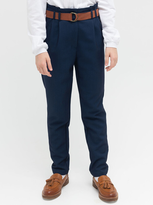 Брюки умеренного объема из костюмной ткани для девочки. Ткань легкая и прочная, почти не мнется. Брюки комфортно носить, за ними легко и просто ухаживать. Пояс декорирован элементом со складками, имеет шлевки под ремень и внутренний эластичный шнур на пуговицах для регулировки объема.  Молния надежно скрыта гульфиком. Карманы имеют комфортный вход для рук, их удобно использовать по прямому назначению. Брюки идеальны для создания школьного образа на каждый день и торжественных случаев.