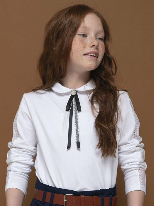 Эластичное кружево по рукаву, круглый воротник с бантом из репсовых и кружевных лент, закрепленный пуговицей с жемчужиной и стразами стильные фишки этой модели. Удобная застёжка сзади воротника позволит легко надеть джемпер и не испортить причёску.