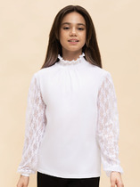 Трикотажная блузка для девочек умеренного объёма, выполнена из эластичного хлопкового материала в комбинации с кружевным полотном. Рукав длинный, из кружевного полотна, с деликатной сборкой по окату и низу. Низ рукава фиксируется узкой манжетой из основного материала.  Новым элементом в блузке является воротник-стойка, собранный с помощью нескольких строчек с эластичной шпульной резиной. Спереди по горловине под воротником спроектирована небольшая сборка.