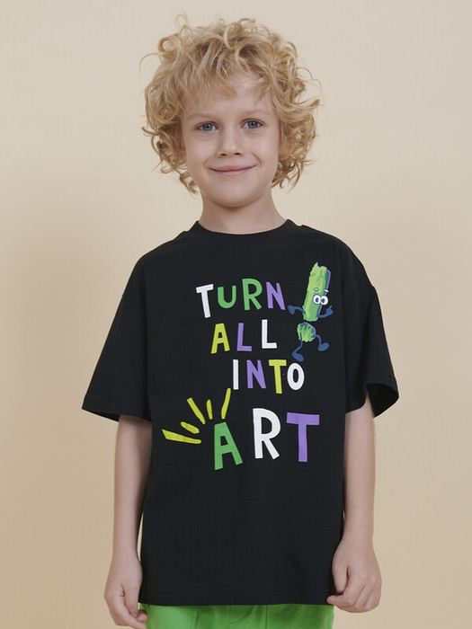 Модель представлена в черном цвете. Черная футболка для мальчика - оптимальный вариант на любой выход. Футболка для мальчика с принтом украшена надписью "Turn all into art" – перевод "Превратим всё в искусство". Изделие привлекает интересным дизайном. Свободная футболка для мальчика подростковая рассчитана на возраст садика и школы. Размерная линейка: 1 (86); 2 (92); 3 (98); 4 (104); 5 (110); 6 (116); 7 (122); 8 (128); 9 (134); 10 (140); 11 (146).
