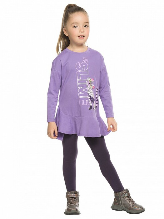 Комплект для девочек туника и лосины. Туника А силуэта с мягким спущенным плечом очень свободного силуэта. Асимметричный низ туники подчеркнут красивым воланом. Фольгированный голографический принт с неоном. Лосины из эластичного трикотажа.
