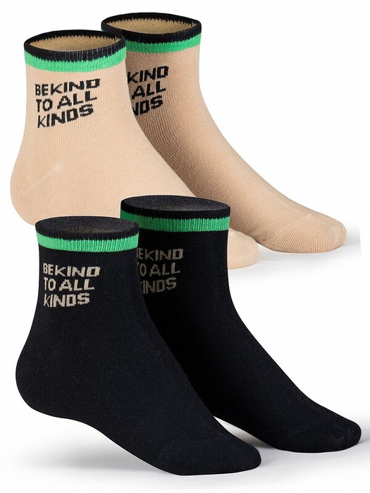 Набор из 2-х пар стандартной длины носков для детей. Носки с высоким содержанием хлопка и добавлением эластана не спадают, не садятся, не теряют форму. Не сползают с ног, с мягкой нетугой резинкой, которая не сдавливает ногу. Перевод принта "быть добрым ко всем". Подойдут для мальчиков и девочек.