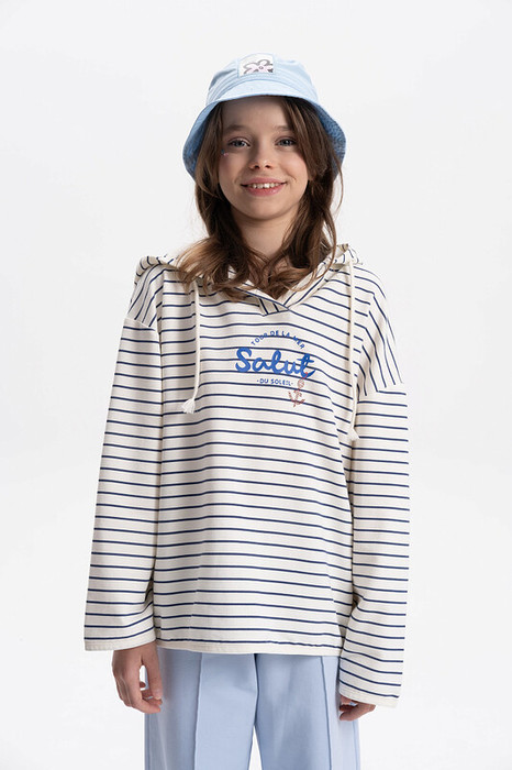 Свитшот в полоску с принтом тельняшка, подходит для девочки подростка. Модный джемпер из высококачественного хлопкового футера можно носить круглый год весной, летом, осенью и зимой. Кофта с капюшоном подойдет для повседневной носки на занятия, в школу, в сад и на прогулку.
