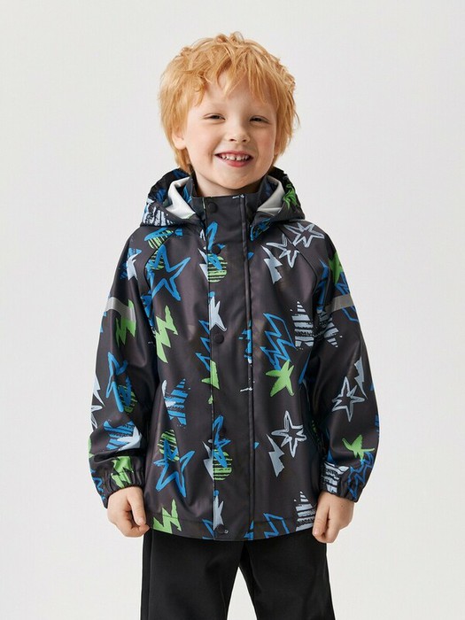 Детская куртка-ветровка для мальчика выполнена из прорезиненной ткани с водонепроницаемым покрытием, которой не страшны дождь и ветер. Модель без утеплителя и подкладки прекрасно подходит для летних дождливых дней. По всей поверхности изделия нанесен принт в виде молний и звездочек. Рукава покроя реглан подходят на разную ширину плеч, что обеспечивает комфортную посадку на разные типы фигур. Низ рукавов собран на резинку для лучшего прилегания к телу во избежание продувания. Спереди расположена застежка на молнию с внешней и внутренней ветрозащитными планками; внешняя планка застегивается на кнопки. Модель со съёмным капюшоном на кнопках универсальна при создании образов. На спинке снизу расположена надпись "OUTDOOR FRIENDLY" англ. - "Снаружи дружелюбно". Модель без карманов. Непромокаемая куртка-дождевик представлена в двух расцветках: темно-сером с принтом для мальчиков и сиреневом с принтом для девочек.