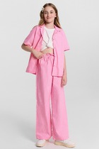 Брюки прямого силуэта, с высокой посадкой. Пояс отрезной из рибаны, с эластичной тесьмой внутри 50RV. По бокам настрочены лампасы из кулирки. Нижние срезы брюк обработаны швом вподгибку.