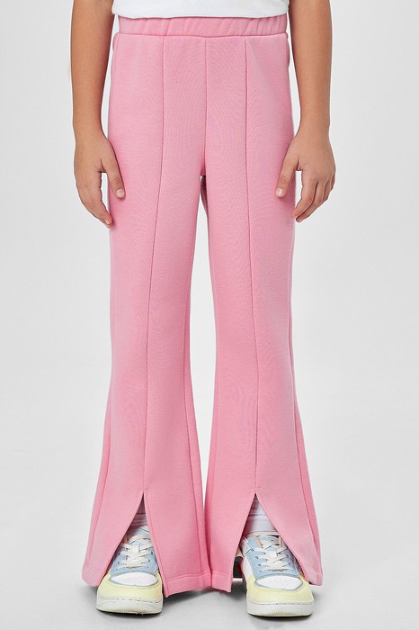Брюки со середней посадкой. Пояс отрезной с внутренней эластичной тесьмой 30RV. Брюки расклешенный к низу. По центру передней части брюк расположен шов, по низу изделия разрезы.