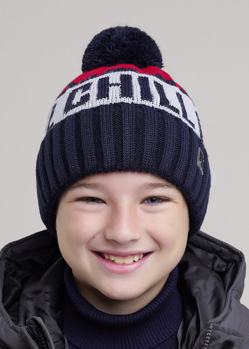 Шапка детская с отворотом и ниточным помпоном, с утеплением флисом по всей голове. Выполнена из высококачественной пряжи, декорирована стильной нашивкой в височной зоне. Станет не только отличной защитой от холода, но и модным аксессуаром.